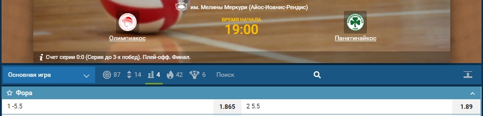 Разберем на примере. Матч по волейболу «Олимпиакос» — «Панатинаикос», до трех побед по партиям. «Олимпиакос» — фаворит, и на него предлагают ставку с форой -5.5. Обратите внимание, что для расчета учитывается число набранных очков. Гандикапы по партиям могут предлагаться в подробной росписи.