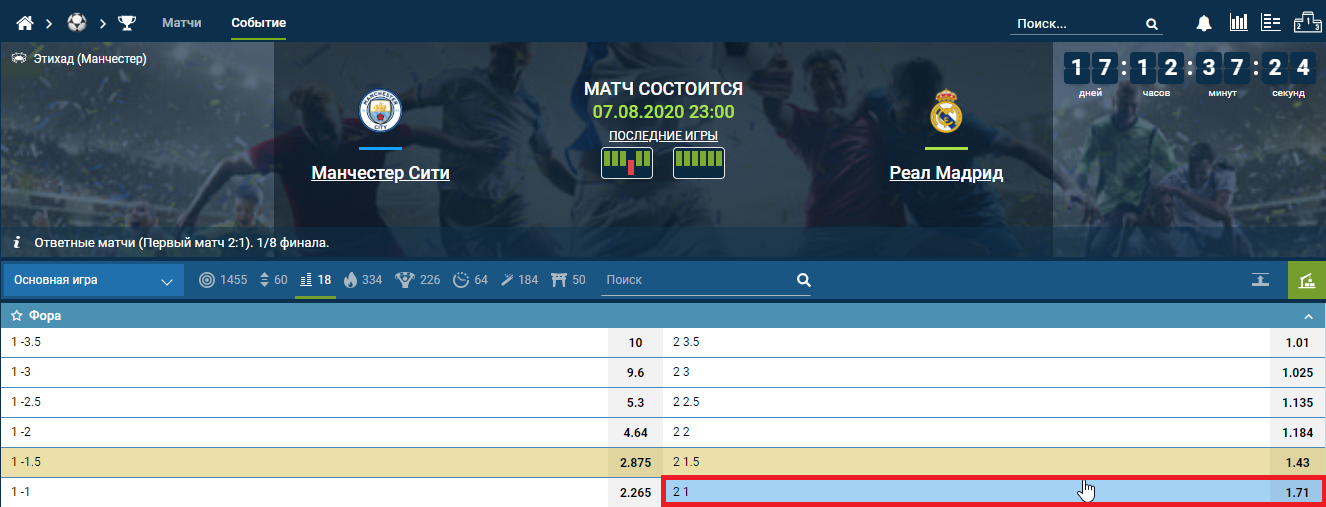 Как понять, выигрывает ли ставка? Допустим, матч завершился вничью 1:1. С учетом форы на вторую команду (+1.0) победа остается за «Реалом» (1:2), ставка выиграла. Если бы «Манчестер Сити» выиграл с минимальным счетом (1:0, 2:1 и т.д.), букмекер вернул бы поставленные деньги, ставка рассчитывалась с коэффициентом 1.0. Более крупная победа хозяев (2:0, 3:1, 3:0 и т.д.) – и ставка Ф2(+1) проигрывает, потому как даже с учетом форы побеждает фаворит («Манчестер Сити»).