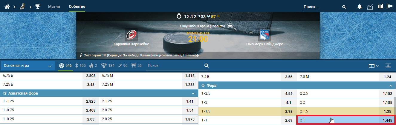 Итог игры — 3:2 в пользу хозяев («Каролина»). За счет форы в одну шайбу на вторую команду в линии итог становится ничейным (3:3), букмекер вернет поставленные деньги.