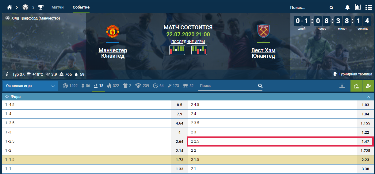 Рассмотрим ставку на фору 2 (+2.5) на примере футбольного матча между «Манчестер Юнайтед» и «Вест Хэм». В этой игре есть явный фаворит в лице хозяев и аутсайдер – гости. Букмекер предлагает сделать ставку на «Вест Хэм» с плюсовой форой 2.5.