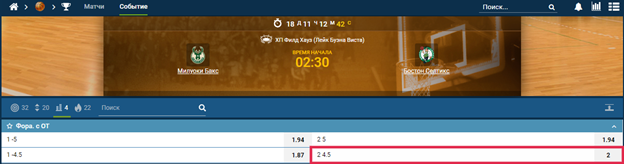 Выиграет ли ставка «Фора 2 (+4.5)», мы постараемся разобраться на примере матча НБА «Милуоки Бакс» — «Бостон Селтикс». «Бостон» — андердог, поэтому букмекер предлагает на него ставку с плюсовой форой. Для расчета учитывается общее количество набранных очков с учетом овертайма. Букмекер может предлагать фору не только на весь матч, но и на четверть или половину матча.