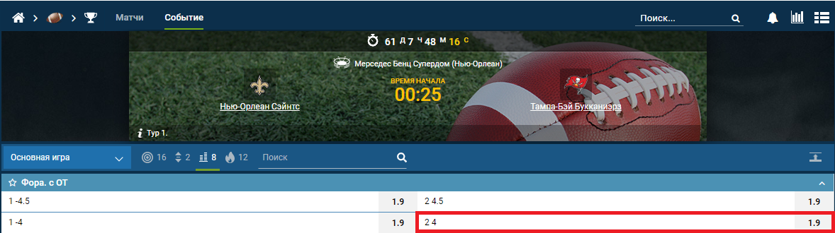 В качестве примера возьмем матч NFL по американскому футболу между клубами «Нью-Орлеан Сэйнтс» и «Тампа Бэй Букканиэрз». «Нью-Орлеан» — явный фаворит встречи, поэтому букмекерская компания предлагает поставить на их победу с форой -4. Для ставки с плюсовой форой выбираем победу по очкам «Тампы Бэй» — Ф2(+4).