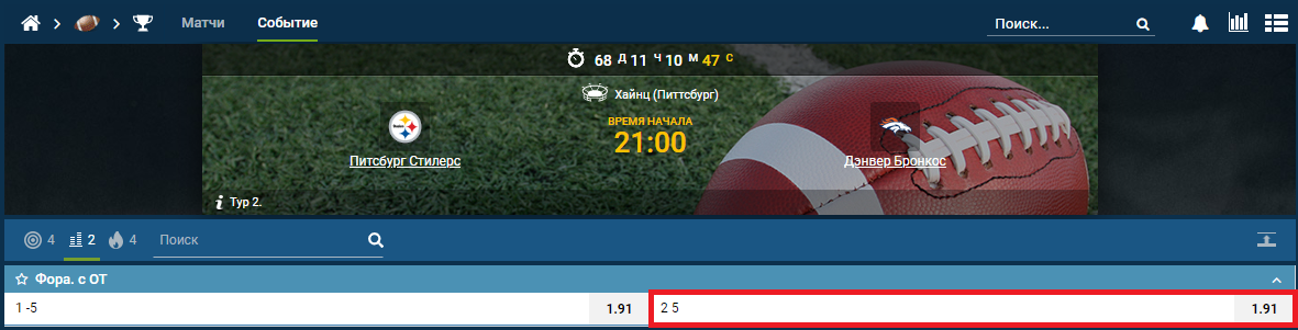 Для примера возьмем матч лиги NFL по американскому футболу между «Питтсбург Стилерс» и «Денвер Бронкос». Явный фаворит игры — команда из Питтсбурга, однако мы ставим на «Денвер» и ждем, что этот клуб сможет навязать борьбу соперникам и не допустит разгромного счета. Также стоит обратить внимание: в этом матче для расчета будет учитываться число набранных очков по итогам встречи, включая возможный овертайм.