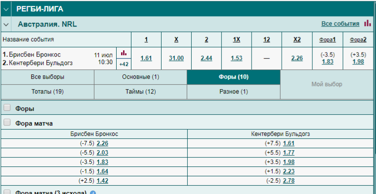 Разберем пример, это реальная линия на матч по регби, «Брисбен Бронкос» против «Кентербери Бульдогз». +5.5 лишь одна из десятка фор, которые предлагает контора.