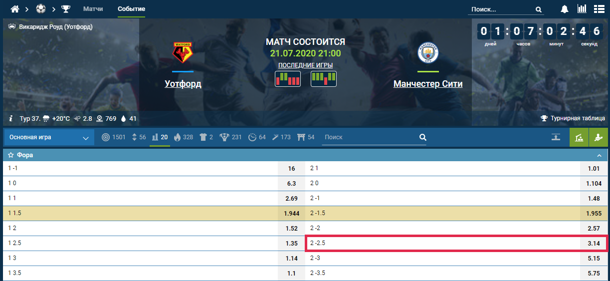 Разберем на примере. Матч по футболу, «Уотфорд» принимает «Манчестер Сити». «Сити» — очевидный фаворит, и на него предлагают ставку с форой -2.5.