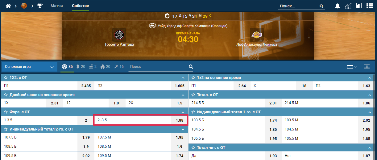 Рассмотрим вариант форы 2 (-3.5) на примере матча НБА между «Торонто Рэпторс» и «Лос-Анджелес Лейкерс». Гости — фавориты встречи, поэтому букмекер предлагает на них ставку с минусовой форой.