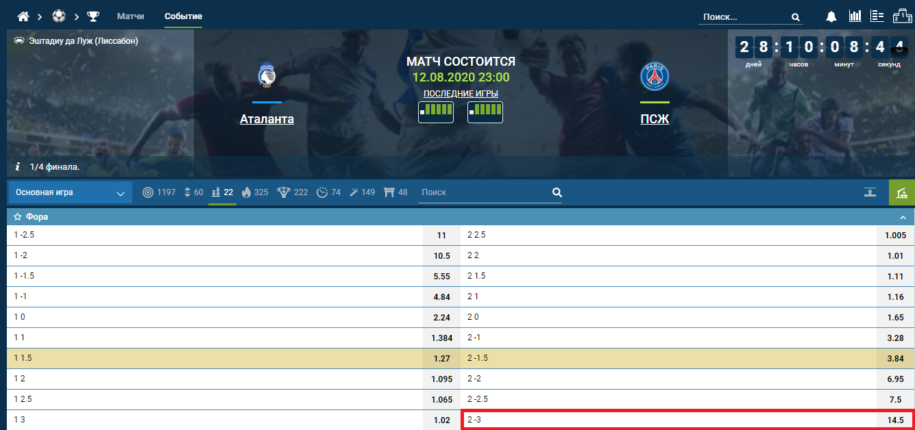 Для примера возьмем матч футбольной Лиги чемпионов между «Аталантой» и ПСЖ. Фаворитом матча согласно букмекерским котировкам считаются гости (ПСЖ), поэтому БК предлагает сделать ставку на победу этой команды с форой (-3). Однако из-за небольшой разницы в классе между соперниками, а также из-за статуса матча такой исход маловероятен. Об этом говорит огромный коэффициент на победу ПСЖ с форой (-3) — 14.5. Пари на победу ПСЖ с разницей в 4 и более мячей в случае успеха может принести 1 350 рублей чистого выигрыша при сумме ставки в 100 рублей.