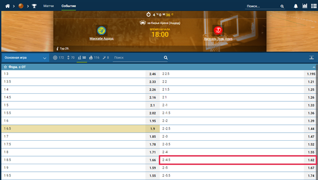Разберем на примере баскетбольного матча чемпионата Израиля «Маккаби» Ашдод — «Хапоэль» Тель-Авив. Фаворит — гости, «Хапоэль», и на них букмекер предлагает ставку с минусовой форой. Для расчета учитывается общее количество набранных очков с учетом овертайма. Букмекерская контора может предлагать фору не только на весь матч, но и на четверть или половину матча.
