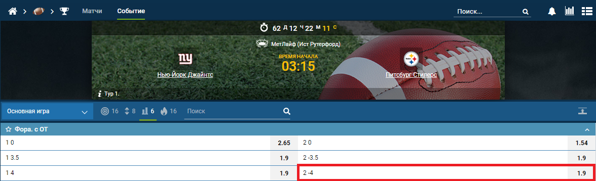 Для примера возьмем матч лиги NFL по американскому футболу между «Нью-Йорк Джайнтс» и «Питсбург Стилерс». «Стилерс» играют на выезде и считаются явным фаворитом матча, поэтому букмекер предлагает ставку Ф2(-4) на эту команду.