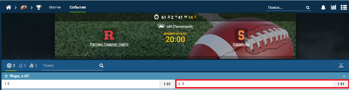 Для примера возьмем матч лиги NCAA по американскому футболу между «Ратгерс Скарлет Найтс» и «Сиракьюс». «Сиракьюс» — явный фаворит встречи, поэтому букмекерская компания предлагает заключить пари на победу этой команды с форой -5.