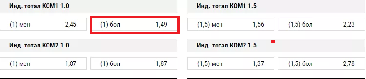 В линии букмекеров такой маркет обозначается по-разному: индивидуальный тотал 1 больше 1.0, ИТБ1 1.0, индивидуальный тотал 1 1.0 больше, индивидуальный тотал первого больше 1.0, ИТ1 больше 1.0, инд тотал ком 1.0 бол.