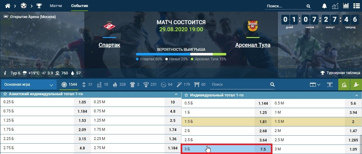 Для примера возьмем матч российской Премьер-лиги «Спартак» — «Арсенал». Ставка ИТБ1(3.0) голов выиграет, если первая команда в букмекерской линии («Спартак») забьет минимум четыре мяча. Букмекер дает довольно крупный коэффициент на такое событие — 7.50. В случае выигрыша пари можно получить 650 рублей чистого выигрыша на каждые 100 рублей ставки. Если хозяева поля отметятся тремя забитыми мячами, БК вернет деньги.