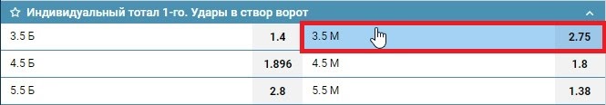 ИТМ1(3.5) означает ставку на то, что первая команда в линии (хозяева) совершит не больше 3 обозначенных игровых действий. Такой вариант вы найдете среди ставок на голы по итогам матча, угловые, желтые карточки, удары в створ ворот, офсайды и на некоторых других маркетах.