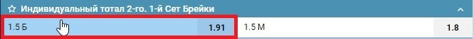 В ставках на теннис БК может представить маркет ИТБ2(1.5) на количество брейков в сете. В примере ниже вероятность такого исхода выражается в коэффициенте 1.91. Сделав такую ставку, можно получить 91 рубль чистого выигрыша в случае успеха.