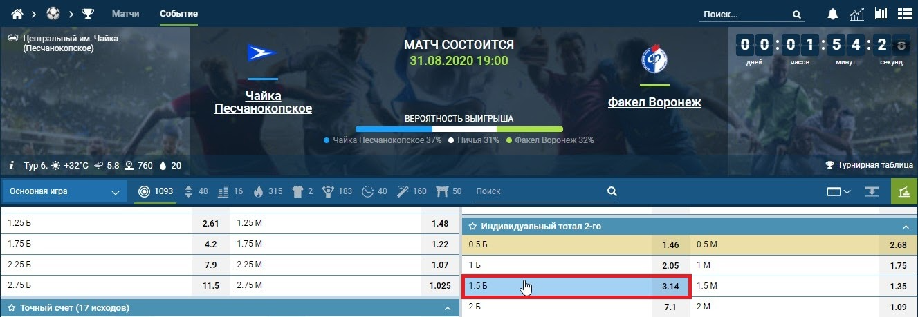 Для примера возьмем матч Футбольной национальной лиги «Чайка» — «Факел». Ставка «ИТБ2(1.5) голов» выиграет, как только вторая команда в букмекерской линии («Факел») забьет два мяча. Букмекер предлагает на такое событие коэффициент 3.14.