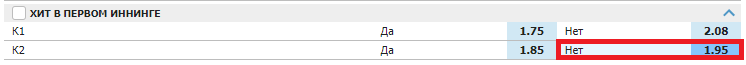 В данном случае ставка в размере 100 рублей сделана на то, что вторая команда (К2) не сделает хит в первом иннинге. Если хит в первом иннинге будет, мы проиграем 100 рублей, если нет — выиграем 195 рублей, или 95 рублей чистой прибыли.