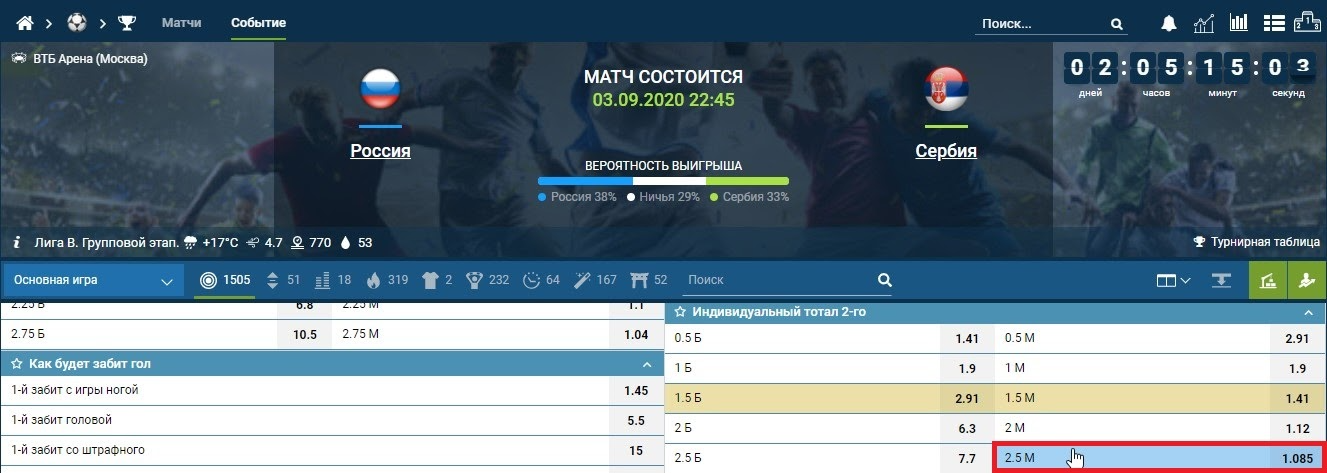 Для примера возьмем матч Лиги наций Россия — Сербия. Ставка «ИТМ2(2.5) голов» выиграет, если вторая команда в букмекерской линии (сборная Сербии) не сможет забить больше двух мячей. Такой исход очень вероятен, поэтому букмекер предлагает на это событие коэффициент 1.085. В случае выигрыша пари можно получить всего лишь 8 рублей чистого выигрыша на каждые 100 рублей ставки.