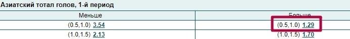 Перед нами матч НХЛ между «Даллас Старс» и «Колорадо Эвеланш». Азиатский тотал первого периода больше 0.75 (или 0.5, 1.0) предложен с кэфом 1.29. Включаем этот рынок в купон ставки и ждем одного из трех событий: