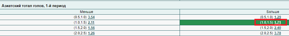 В хоккее за один период могут забить столько же, сколько в футболе за весь матч. Поэтому тотал больше 1.25 встречается в хоккее для заключения пари в определенном периоде.
