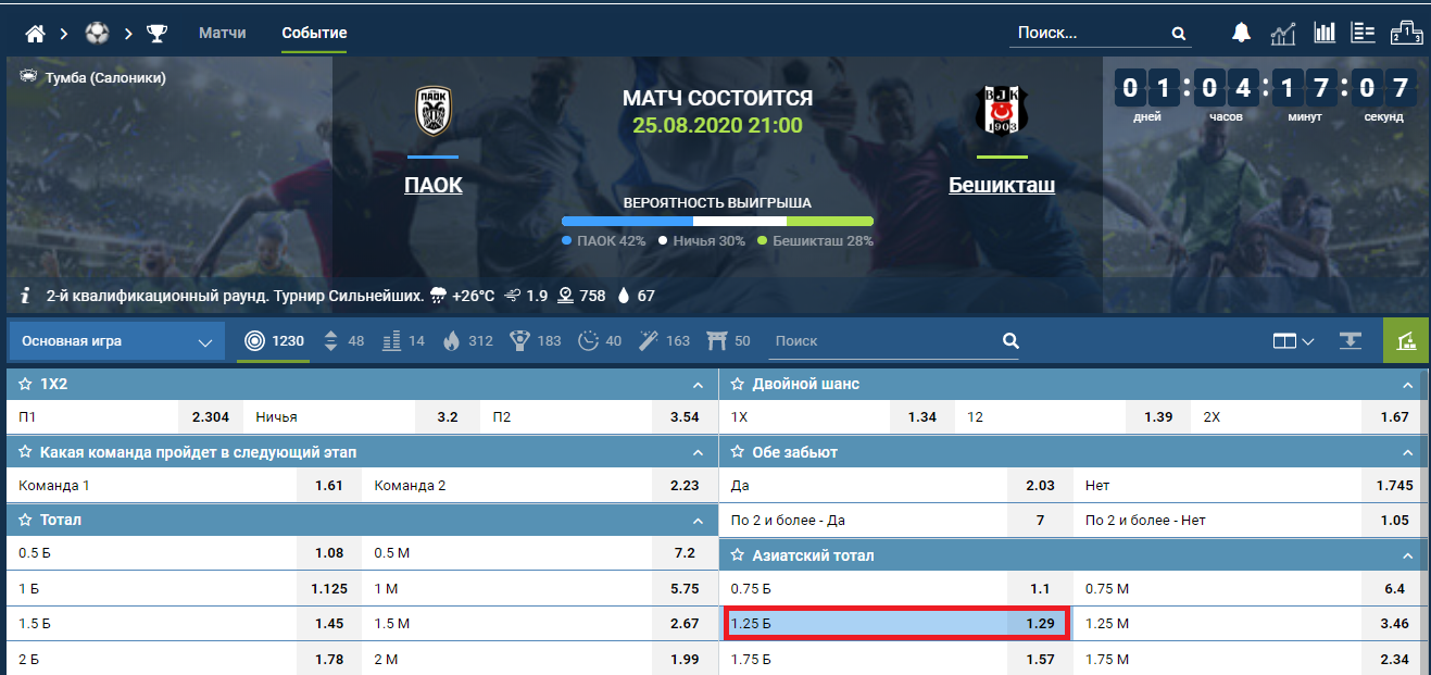 Рассмотрим, как работает азиатский тотал, на примере футбольного матча между командами ПАОК и «Бешикташ» в рамках второго квалификационного раунда отбора Лиги чемпионов.