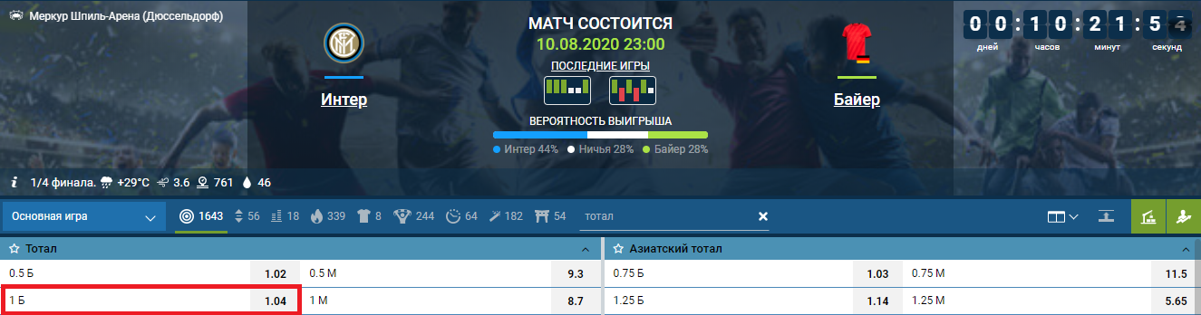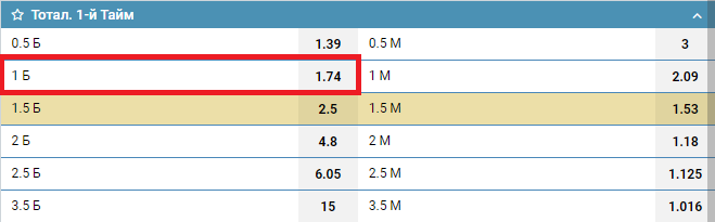 Также в матче можно поставить на тотал голов больше 1.0 по таймам. На эти события коэффициенты выше, чем в предыдущем случае. Для примера: в росписи на тот же матч «Интер» – «Байер» котировка на ТБ(1.0) в первом тайме 1.74. При ставке в 100 рублей можно получить 74 рубля чистого выигрыша, если в первом тайме будет забито два и больше мячей.