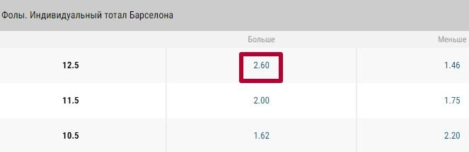 Допустим, «Барселона» в матче с «Севильей» нарушила правила 14 раз. В таком случае ставку рассчитают с выигрышем, и на счет поступит сумма ставки, умноженная на 2.60: это по 160 рублей чистого выигрыша на каждые 100 рублей ставки.