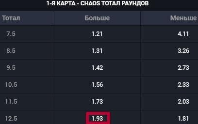 К примеру, в матче Furia — Chaos есть пари на тотал раундов Chaos в первой карте. Игрок, поставивший на ТБ(12.5) с множителем 1.93, может выиграть по 93 рубля чистыми на каждые 100 рублей ставки.