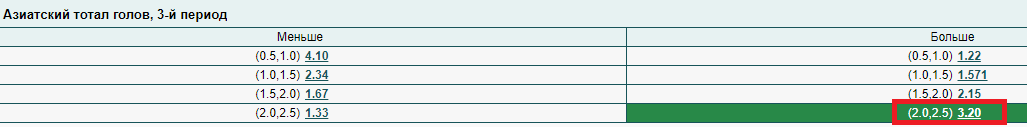 Чтобы ставка выиграла, команды должны забросить три или больше шайб в третьем периоде.