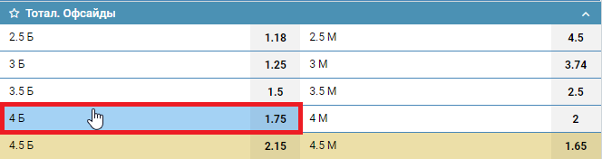 Еще один вариант нашей ставки — тотал офсайдов больше 4.0 за игру. Ставка сыграет, если за весь матч положение «вне игры» будет зафиксировано 5 раз или больше. Коэффициент на такое событие 1.75 — 75 рублей чистого выигрыша на каждые 100 рублей ставки. Если судья покажет «офсайд» ровно 4 раза, букмекер вернет поставленные деньги.