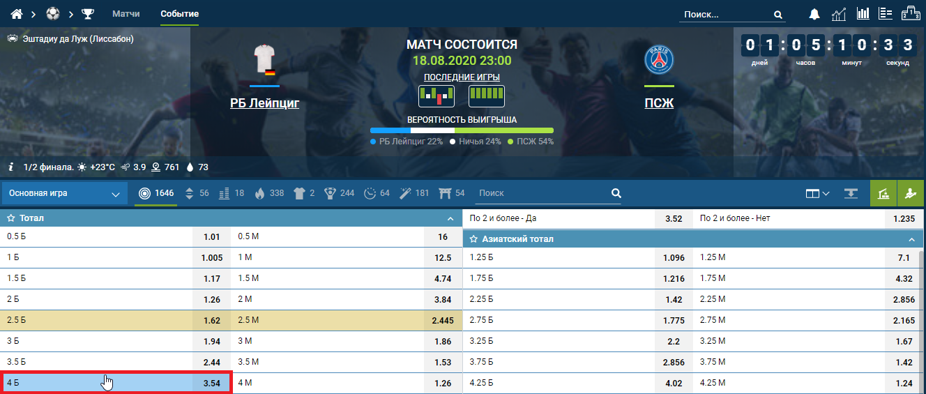 Для примера возьмем матч Лиги чемпионов между «РБ Лейпциг» и ПСЖ. Ставка ТБ(4.0) выиграет, если в матче будет забито пять или больше голов.