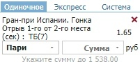 В гонках букмекеры предлагают ставку 7 Б на отрыв победителя от второго места. Стоит отметить, что в отличие от других ТБ(7) в гонках ставка без возврата. Если отрыв будет ровно 7 секунд, ставка сгорит.