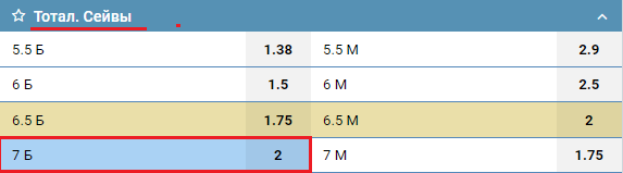 Разберем ставку 7 Б на количество отраженных ударов вратарем (сейвы). Если в матче будет восемь сейвов и больше, мы выиграем, если семь — возврат ставки. В случае шести сейвов ставка сгорит.
