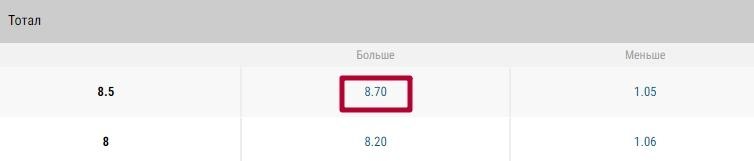 В хоккейных матчах результативность выше, чем в футбольных, но даже там редко забрасывается более восьми шайб. Неудивительно, что в нашем примере ТБ(8.5) дается с коэффициентом 8.70.