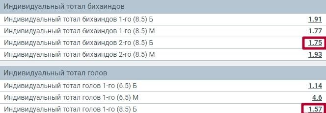 Также маркет ТБ(8.5) вы найдете в блоке индивидуальных тоталов штрафного времени. Такая ставка выиграет, если за время матча игроки выбранной вами команды наберут 9 и более минут штрафа.