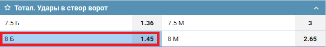 Разберем ставку 8 Б в размере 1000 рублей на количество ударов в створ ворот.
