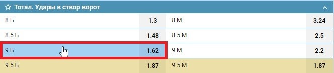 В нашем примере букмекер предлагает поставить ТБ(9.0) на количество ударов по воротам в течение основного времени матча. Ставка выиграет, если команды общими усилиями нанесут 10 и больше ударов. Коэффициент на это событие — 1.62. Поставив на такой исход 100 рублей, можно получить 62 рубля чистого выигрыша.
