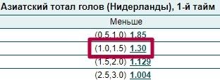 Возврат 50% пари и выигрыш 50% пари. Если в стартовой 45-минутке голландцы забьют один мяч, то 1500 рублей со ставки на ТМ(1) вернутся на счет беттору, а 1500 рублей со ставки на ТМ(1.5) выиграют и принесут чистый выигрыш 450 рублей.