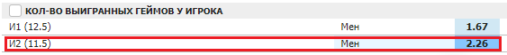 В теннисе тотал меньше 11.5 можно встретить среди котировок на количество выигранных геймов у игрока (индивидуальный тотал).