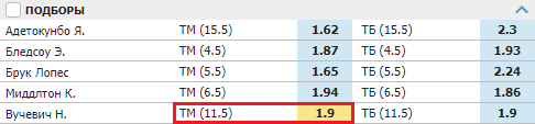 В примере будет подсчитываться количество подборов. Вучевич не должен совершить больше 11 подборов за игру, чистый выигрыш составит 900 рублей при ставке в 1000 рублей. Если ему удастся сделать 12 и больше подборов, пари проиграет.