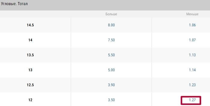 Данное событие считается очень вероятным, поэтому коэффициент на него невысок — 1.27. Если в основное время матча игроки выполнят менее 12 угловых, на каждые 1000 рублей ставки беттор получит 270 рублей чистой прибыли. Если угловых будет ровно 12, букмекер вернет ставку; как только назначается 13-й угловой, ставка проигрывает.