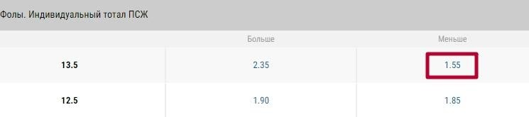 Рассмотрим в качестве примера индивидуальный тотал фолов ПСЖ в матче с «Марселем».