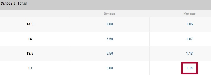 В случае 14 и более подач с углового флажка ставка сгорит, а мы проиграем деньги.