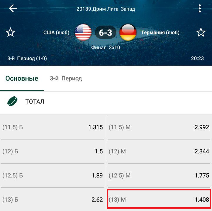 В матче идет третий период, на табло 6:3. В данной ситуации ставка с учетом (13) М выиграет, если за остаток основного времени забьют не более 3 шайб. Чистый выигрыш составит 408 рублей при ставке в 1000 рублей. В случае 13 голов ставка в размере 1000 рублей вернется на счет, а как только одна из команд забьет 14-й гол, ставка проиграет — минус 1000 рублей.