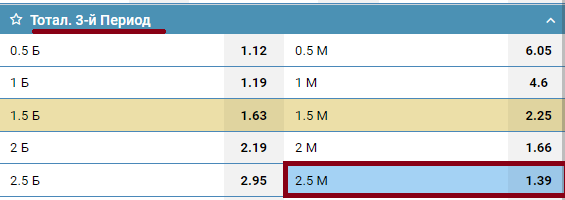 В данном примере ставка на тотал 2.5 М в третьем периоде. Она сыграет, если в третьем периоде забьют не больше двух шайб. Мы проиграем, если будет забито три и больше голов.