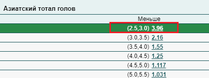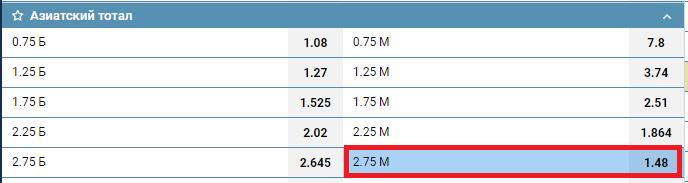 В данном случае букмекер сразу отображает азиатский тотал, разделенный на две части (2.5, 3.0), чтобы клиенту было проще воспринимать маркет.