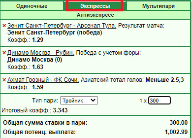 Для примера составим экспресс из трех матчей, поставим 300 рублей.