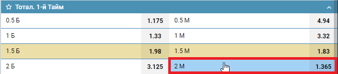 М — сокращение от «меньше» указывает на то, что ставка выиграет, когда событий меньше определенного числа.