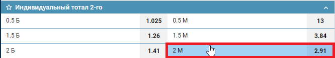 Еще один маркет с таким тоталом — индивидуальный подсчет голов. Вторая команда в линии («Бавария») отличается высокой результативностью, поэтому коэффициент на это событие довольно крупный — 2.91. Пари выиграет, если футболисты «Баварии» не смогут забить или отличатся за всю игру только один раз. Если игроки немецкого клуба забьют два мяча, БК рассчитает ставку с коэффициентом 1.00, вы вернете поставленные деньги.
