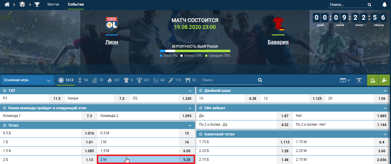 Для примера возьмем матч Лиги чемпионов между «Лионом» и «Баварией». Ставка ТМ(2.0) выиграет, если в основное время матча будет забит один гол либо игра завершится нулевой ничьей.