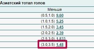 Азиатский тотал меньше 3.25 — пари с подстраховкой на то, что в игре или ее временной отсечке случится не более трех голов. Ее специфика в делении ставки на две половины: одна переносится на ТМ(3), а другая — на ТМ(3.5).